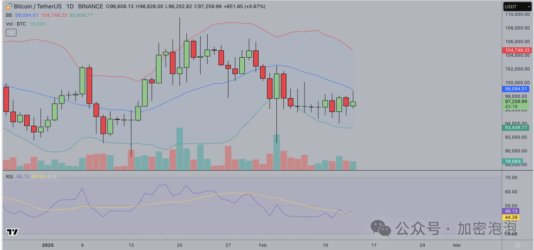 比特币价格预测图的态势较为疲软且呈看涨状。发稿时,其价格处在布林线中线下方且处于盘整状态,与 97260 美元较为接近。若价格未能上升且稳定在 97000 美元之上,空头就会再度掌握主导权。